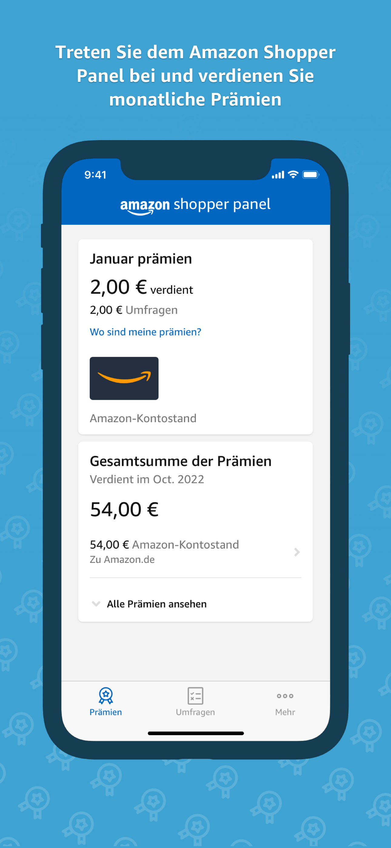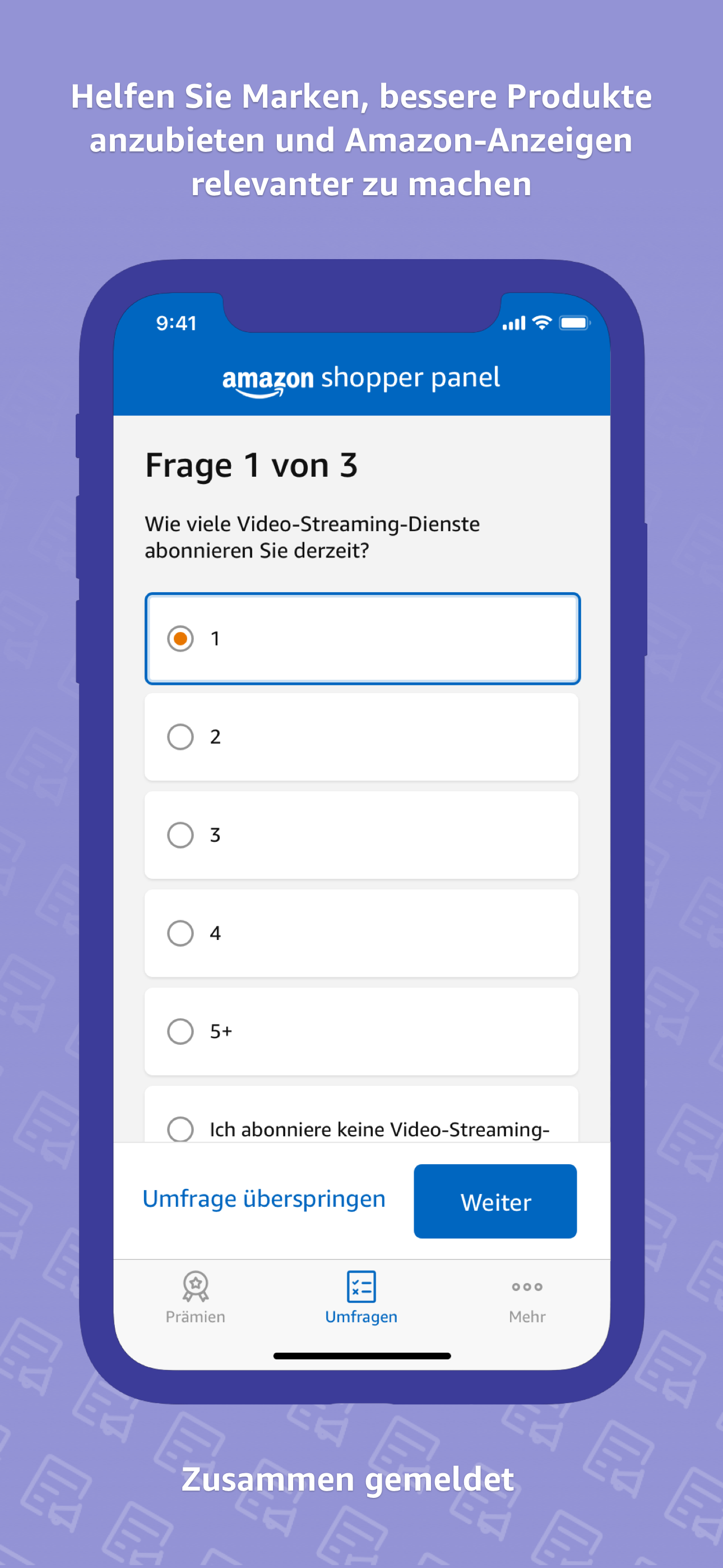 Das Amazon Shopper Panel ist ein optionales, nur auf Einladung zugängliches Programm, bei dem Teilnehmer durch das Ausfüllen kurzer Umfragen monatliche Belohnungen verdienen können.