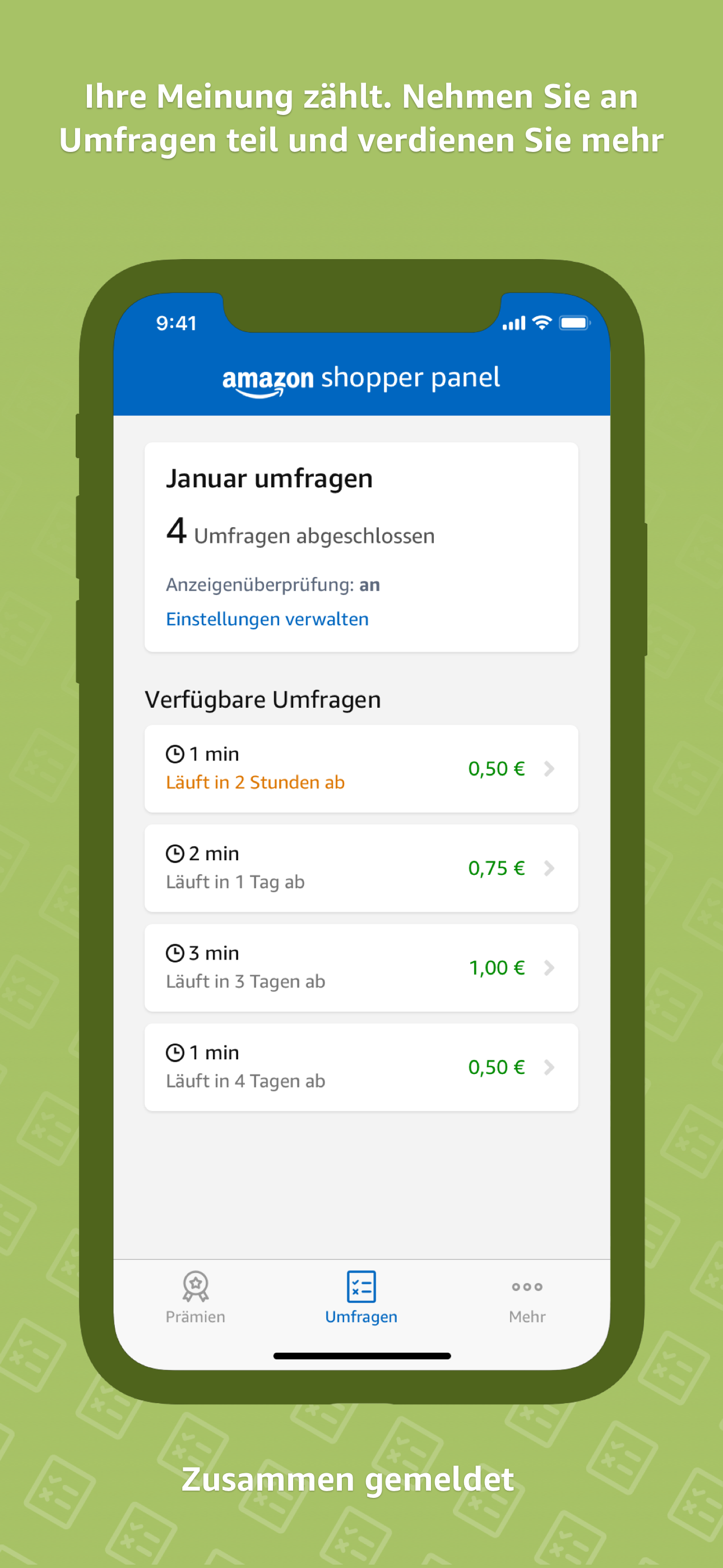 Sie erhalten jeden Monat Belohnungen für jede Umfrage, die Sie ausfüllen. Der Platz ist begrenzt und Sie sind möglicherweise nur zur Teilnahme an bestimmten Teilen des Programms berechtigt. Sie können überprüfen, ob Sie berechtigt sind, indem Sie in der App auf die Registerkarte „Umfragen“ tippen. Sie können die Anzeigenverifizierung auf Ihrem Mobilgerät aktivieren, um jeden Monat mehr relevante Umfragen zu erhalten, die auf den Anzeigen basieren, die Sie bei Amazon sehen. Anzeigen von Amazon können Amazon-eigene Werbung oder Drittanbieter enthalten, die über Amazon werben.