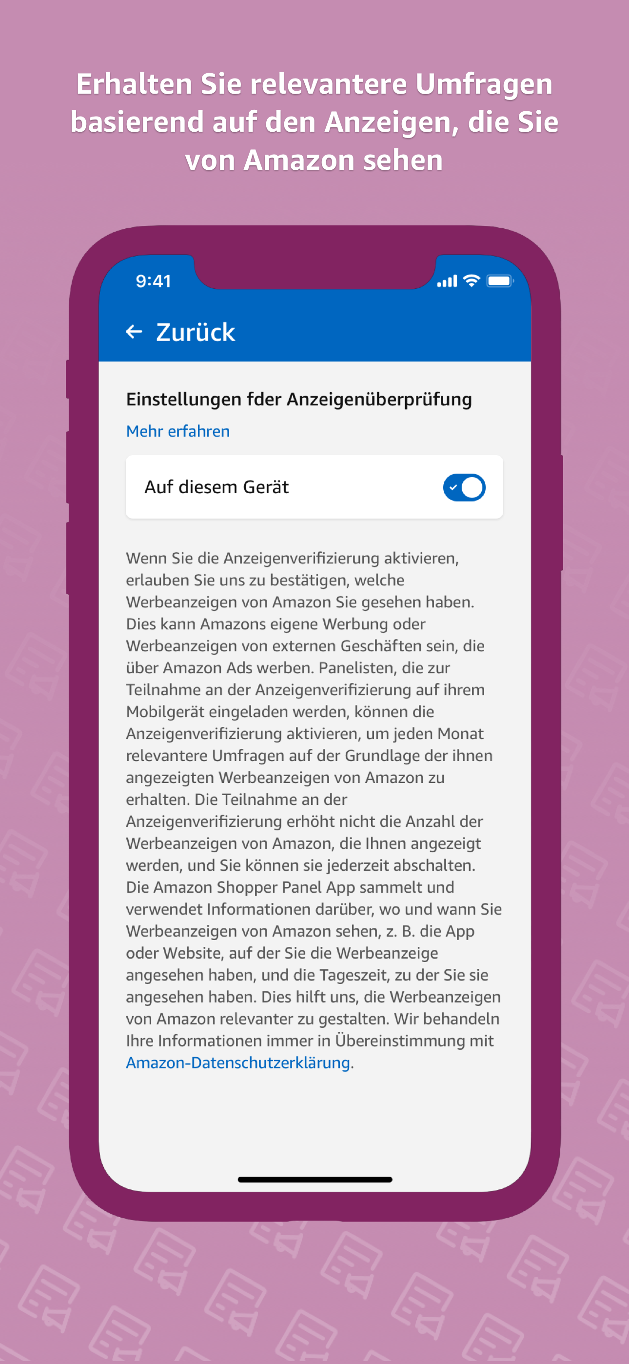 Die Teilnahme am Amazon-Shopper-Panel ist freiwillig und Panelisten können die Nutzung der App, die Beantwortung von Umfragen oder die Aktivierung der Anzeigenüberprüfung jederzeit beenden.Amazon erhält nur Informationen, die die Panelisten ausdrücklich über das Shopper-Panel teilen, z. Umfrageantworten oder Anzeigen, die sie gesehen haben.